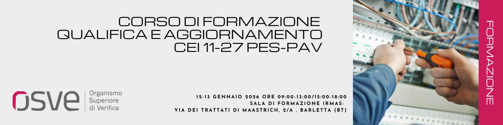 Corso di formazione QUALIFICA E AGGIORNAMENTO CEI 11-27 PES-PAV 12-13 gennaio 2026